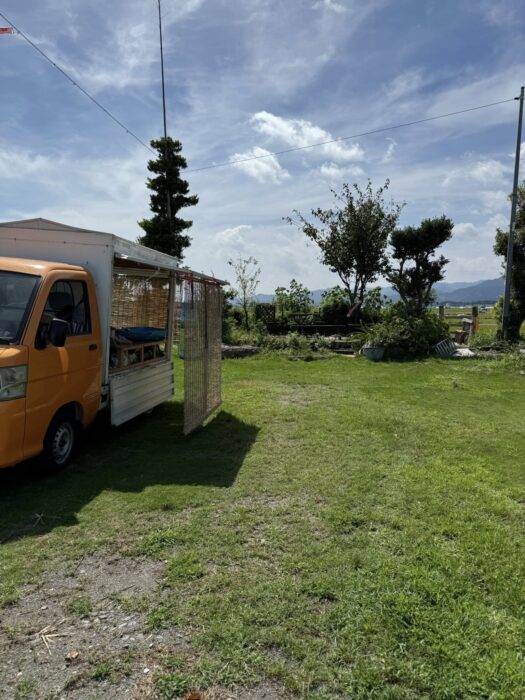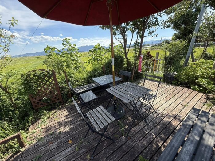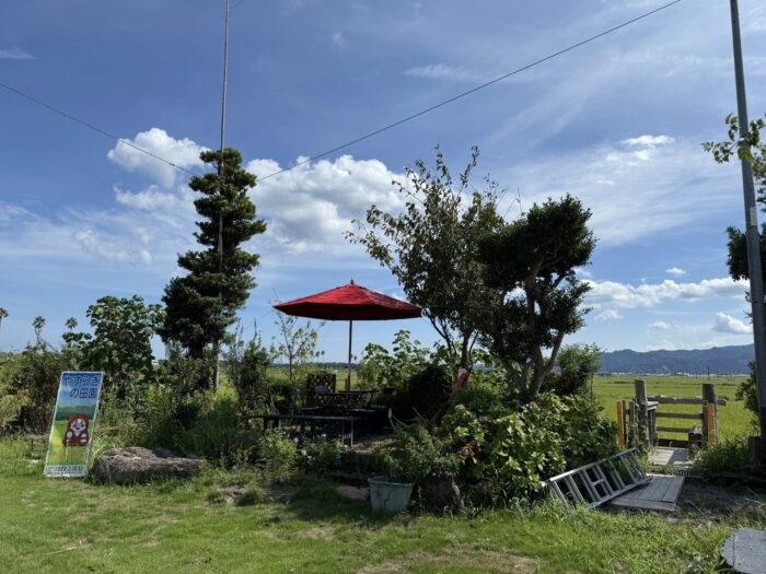 真夏の紫外線で真っ白になりました。昨年はスプレー缶3本で赤いパラソルにしましたが、8月の 1ヶ月で脱色しました。今回はペンキを厚めに塗りました。